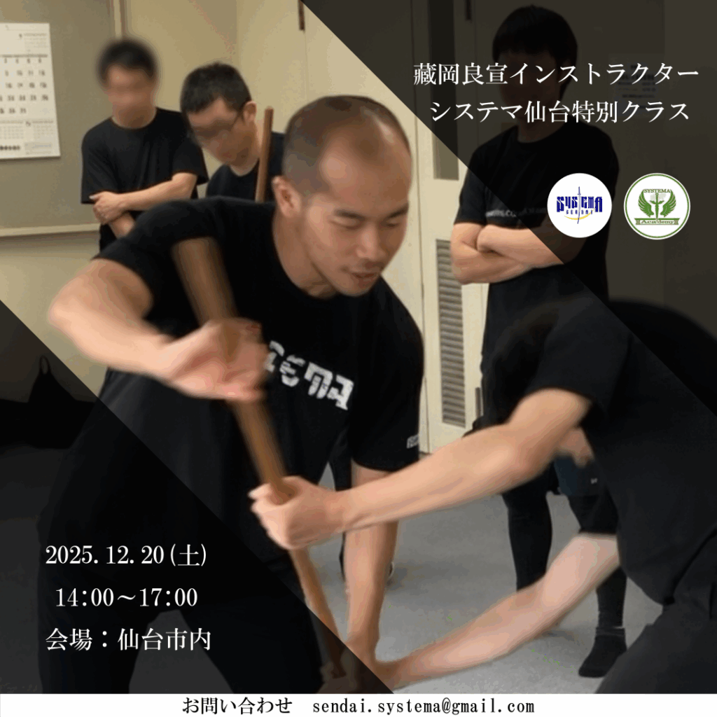 NEWS 2025.09.112025.11.19 システマ仙台の最新情報は、下記ブログにて更新中です。 システマ仙台練習日記仙台を中心に活動を始めたシステマトレーニングでのシステマ的な日常 セミナー情報 ↓お申し込みはこちら 蔵岡インストラクター出張仙台特別クラス申込み(2025.12.20)蔵岡インストラクター 出張仙台特別クラス申込み2025/12/20(土)会場:仙台市内 14:00~17:00 (着替え入退出を含む・途中入退場可)参加費:8,000円 事前申し込み割(締め切り10/22) :9,000円 当日☆初め...